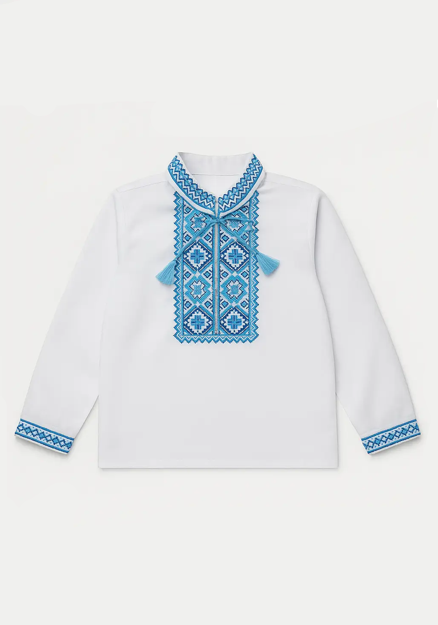 Стильна вишиванка для хлопчика, ідеальний вибір для маленького патріота. Модель виконана з натуральної бавовняної тканини, прикрашена традиційним українським орнаментом у ніжних блакитних тонах — символі чистого неба. Має машинну вишивку хрестиком та застібку на шнурівці.